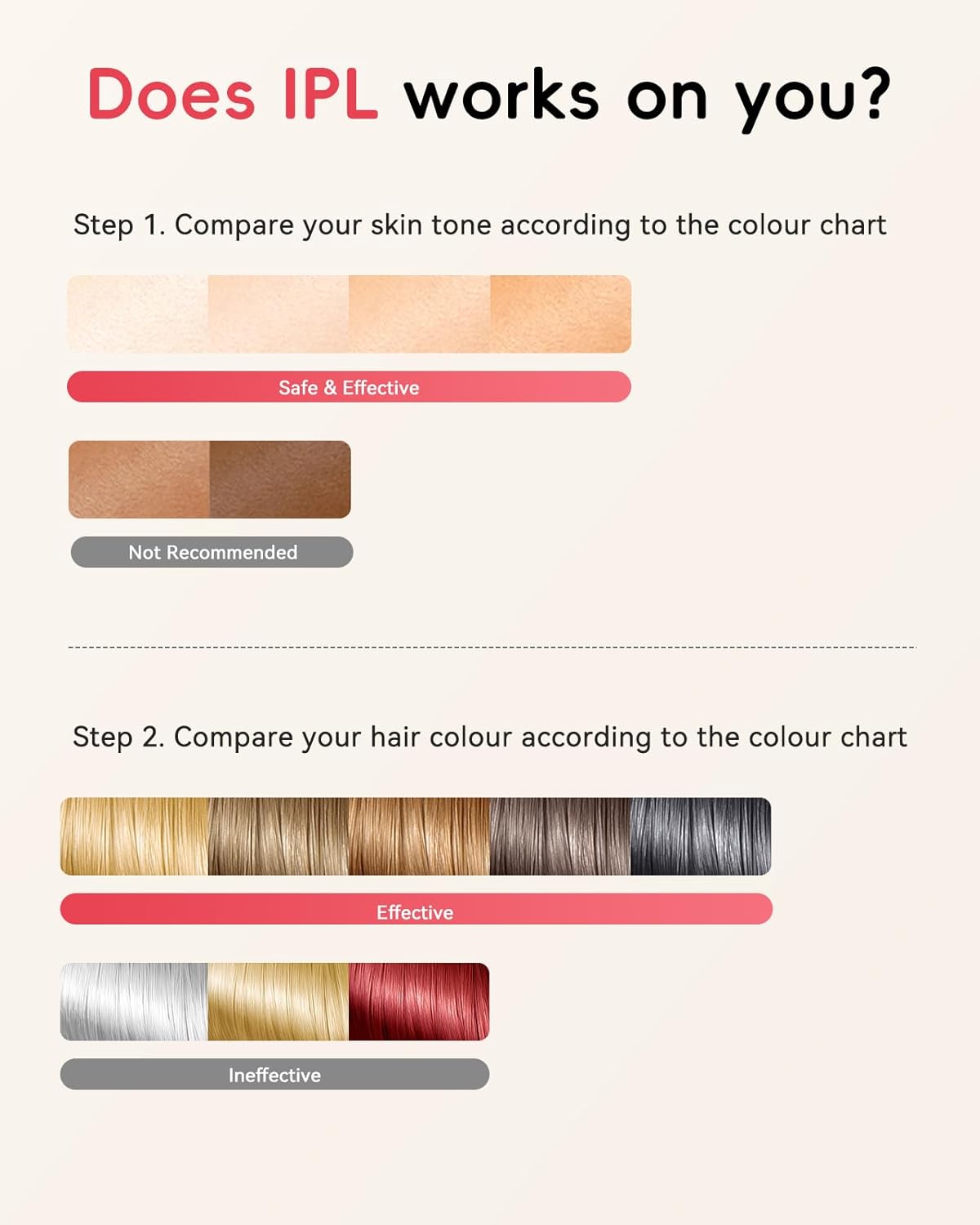 - 𝐑𝐆𝐁 𝐋𝐢𝐠𝐡𝐭𝐬 𝐟𝐨𝐫 𝐚 𝐅𝐮𝐧 𝐄𝐱𝐩𝐞𝐫𝐢𝐞𝐧𝐜𝐞: The vibrant RGB lights in our IPL hair removal device add a fun and dynamic atmosphere to every use, transforming boring routines into a magical beauty ritual. Check the color check image to see if your skin tone and hair colour are suitable for this body laser hair removal device.