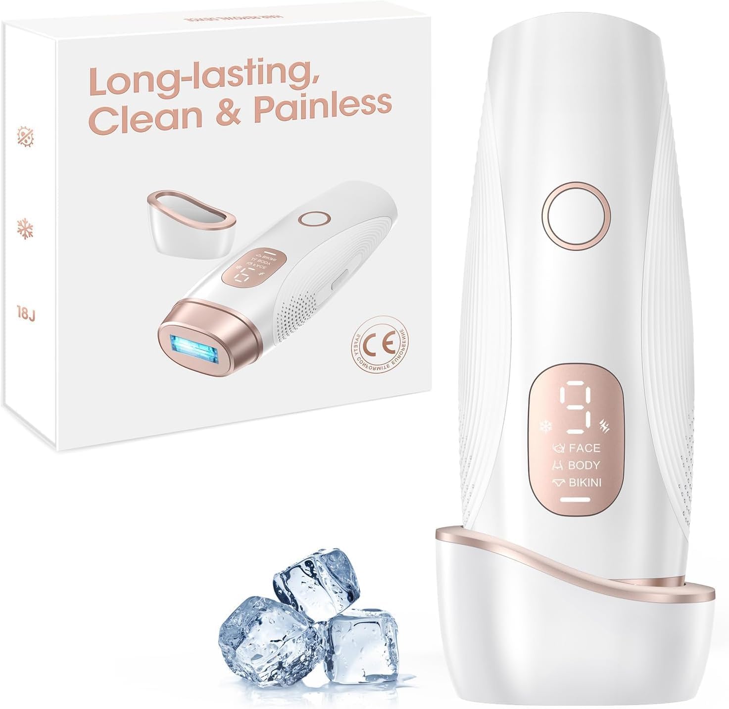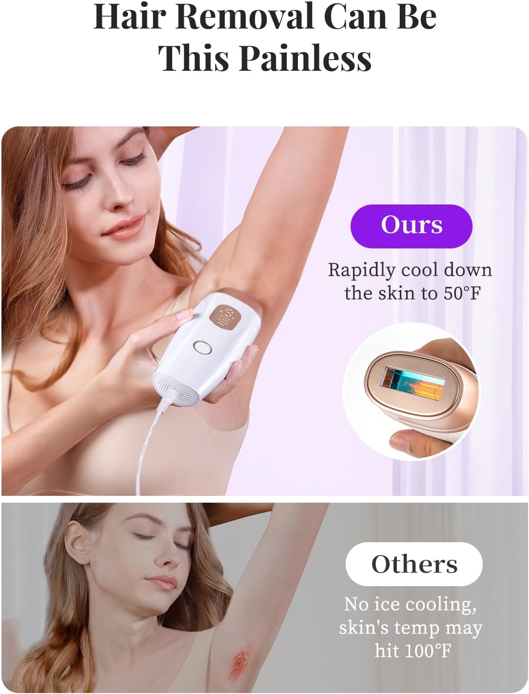 - [Painless and Effortless Hair Removal]: Ice cooling technology quickly cools the skin down to 10℃, reducing pain and discomfort. Our laser hair removal device allows you to enjoy a comfortable hair removal at home. Say goodbye to painful or expensive hair removal methods.