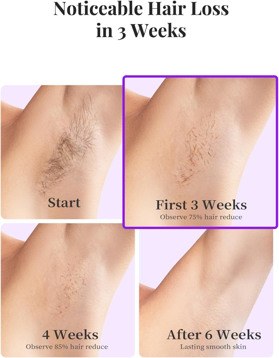 - [Noticeable Hair Reduction in 3 Weeks]: Our laser hair removal device has a maximum energy of 18J and 600-1200nm. So you can notice visible hair reduction in 3 weeks and enjoy hair-free skin in 6 weeks. Always start with level 1 for each use.