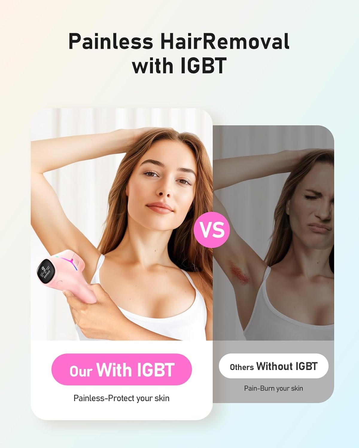 - [Nearly Painless Hair Removal at home] Double IGBT pulse technology and realize 0.12S fast flash can deliver two consecutive pulses, reduces the pain caused by a single energy to achieve painless hair remover, max 22J can deep reach and accumulate target hair follicle melanin to fast and effeive removing.