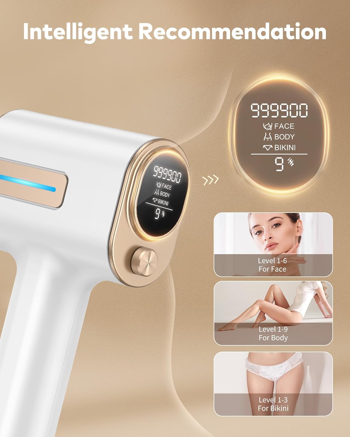 - [Customised Modes for Different Areas]: 9 adjustable intensity levels and targeted modes for your hair removal needs: bikini, face and body. From sensitive areas to large areas, this IPL hair remover for women offers a safe, personalised hair removal experience.